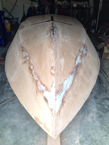 I'm sanding the completed hull, and filling in screw holes and any dips or gaps in the wood. I'm using filler mixed with resin to fill in gaps, then sanding with a belt and hand sander. I'm making a ton of sawdust, and slowly getting a smooth hull.